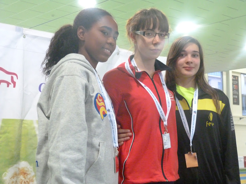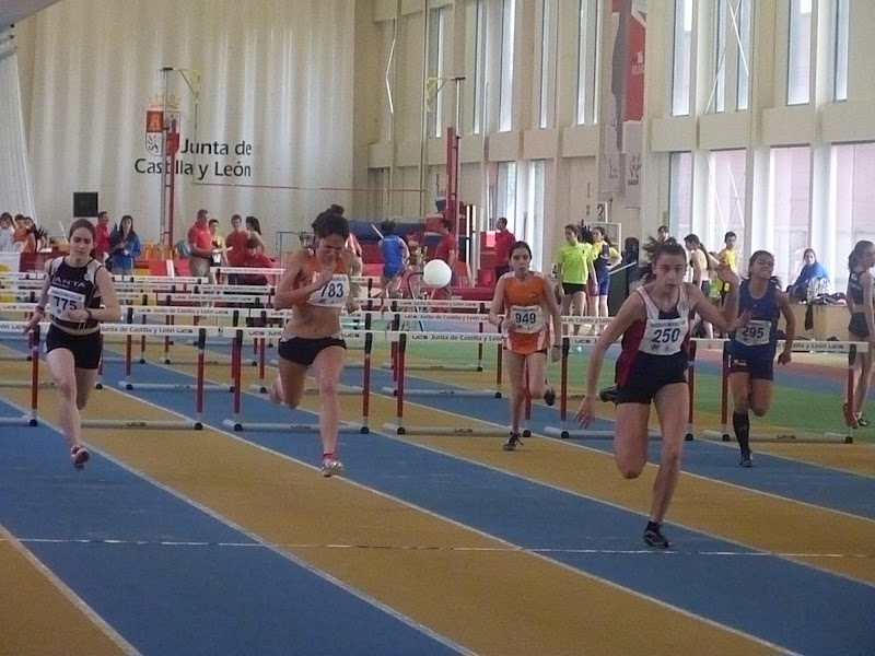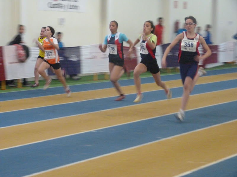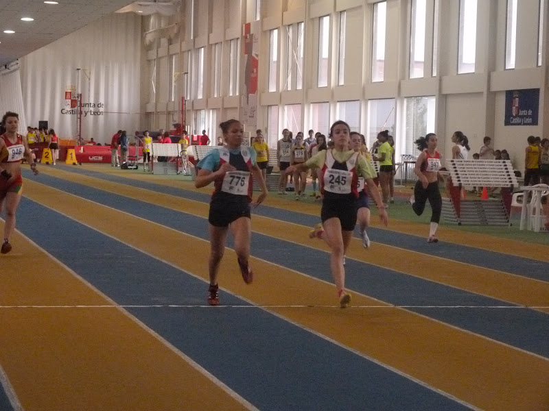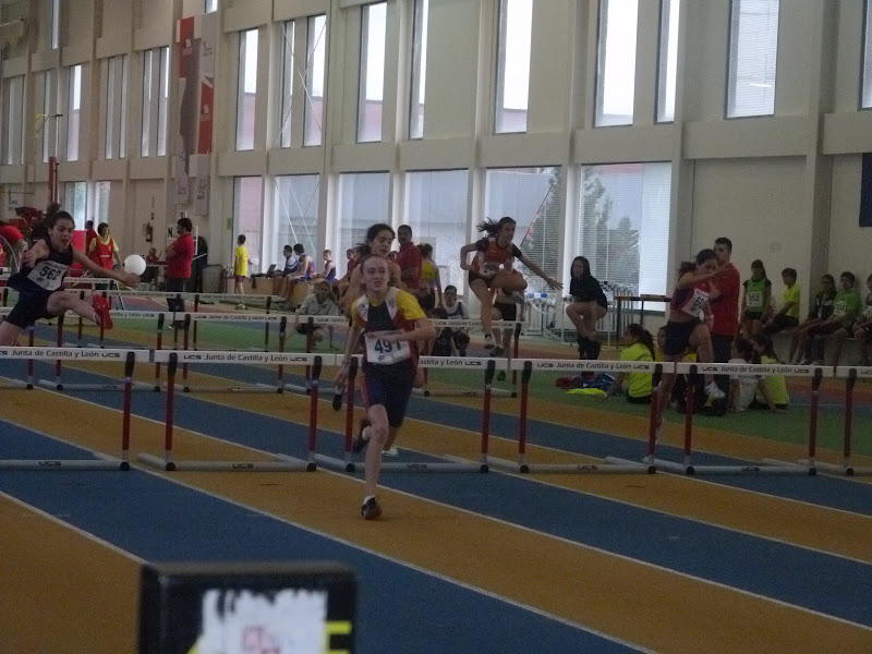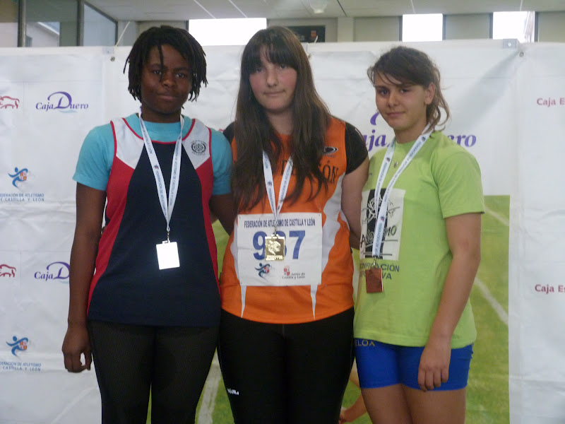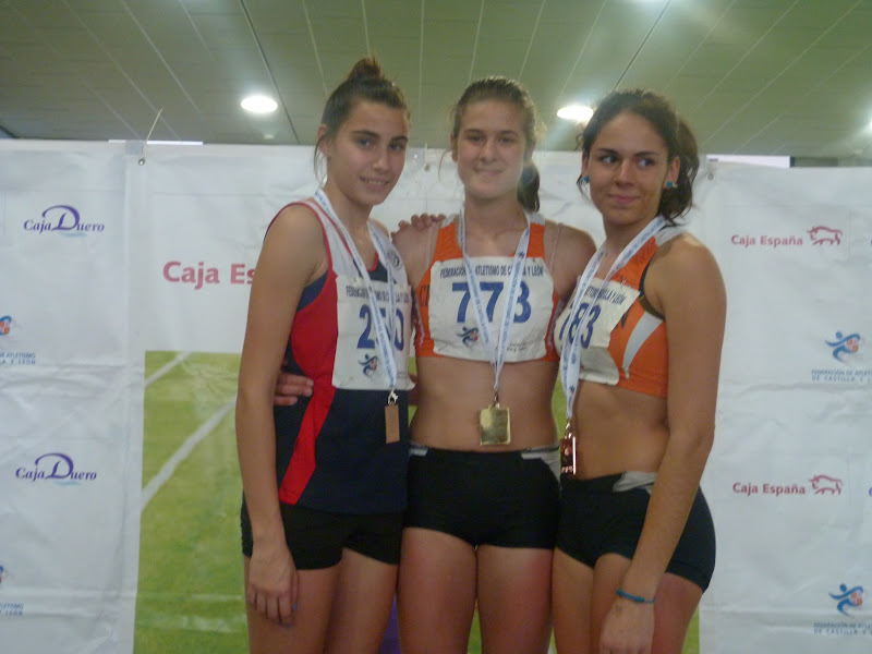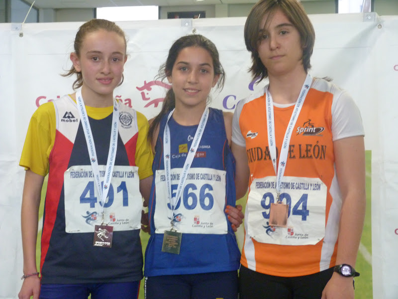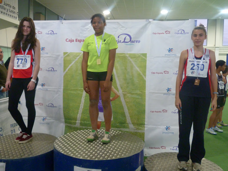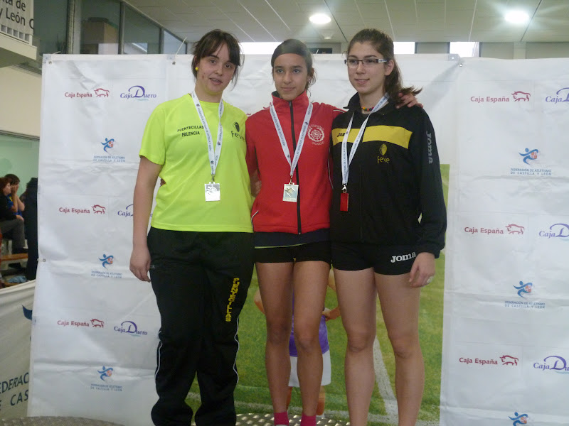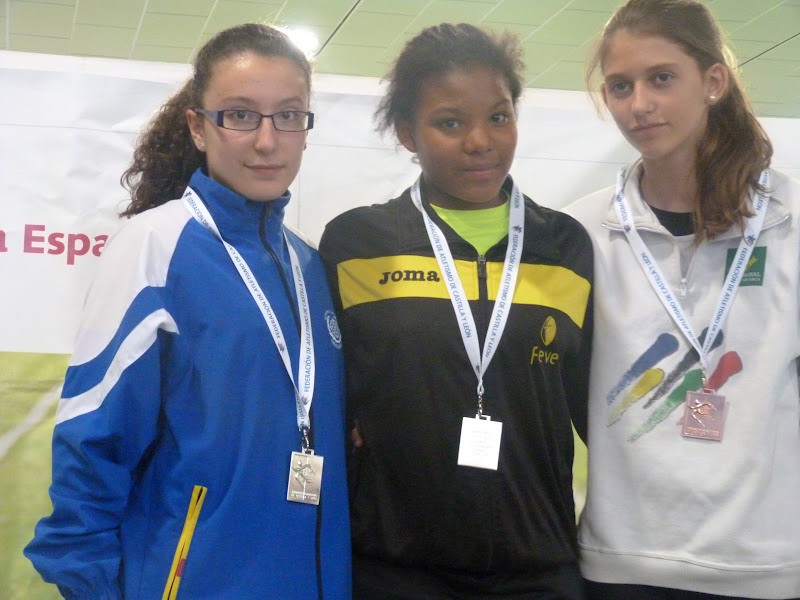 En cadetes, chicas, espléndida cosecha, destacando Flor Diez, doble oro en 60, con 8.17 y en pértiga, con 2,65. Otra victoria obtuvo Clara Ruiz, en longitud, con 4,74,con su compañera María Martín, segunda, tanto en longitud, con 4,64 como en triple, con 10,17, cerrando la espléndida cosecha de oros Mónica Mendoza, en peso , 10,88, además de ser plata en 60, con 8.23. La plata la obtuvo Beatriz Torre, en 60 vallas, con 9.30, añadiendo un bronce en altura, con 1,49.