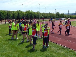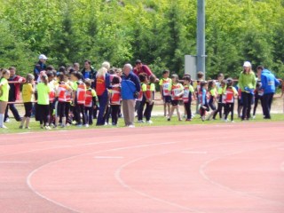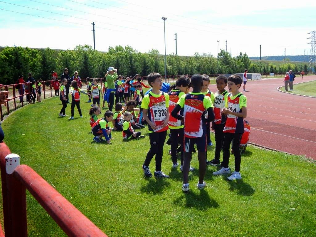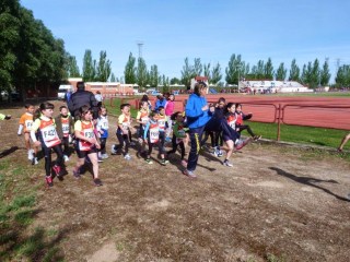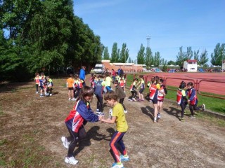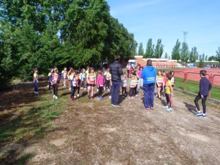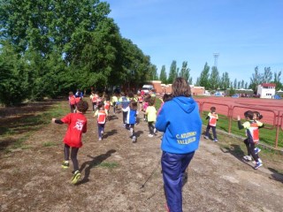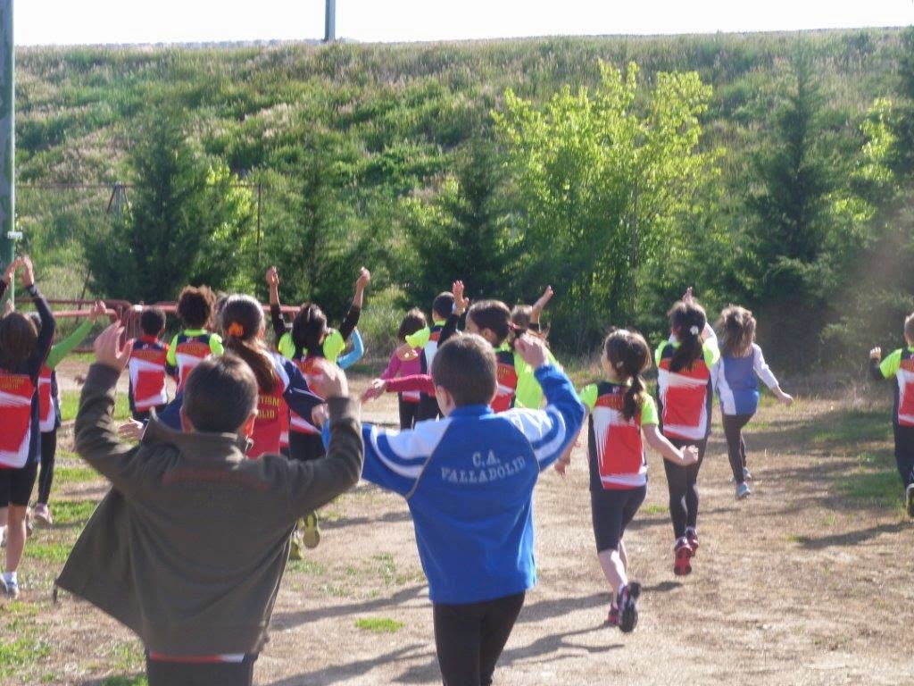 Muchos niños, muchas niñas, muchos padres muchos abuelos…buen ambiente, y los escolares del Club Atletismo Valladolid, pues como siempre, se lo pasaron pipa, unos ganaron y otros casi, pero todo fenomenal, con ese comienzo divertido, con el original calentamiento dirigido por Ana y por Oliver, así empezamos con unas risas…