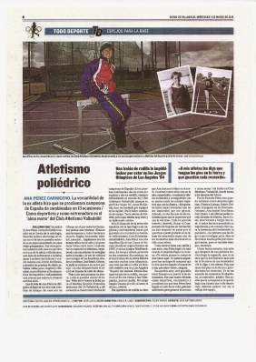Pues eso, que en dos semanas consecutivas, a página por semana, El Mundo, en su edición local, que se llama Diario de Valladolid, y en el suplemento de Deporte Base, ha sacado una entrevista a Ana Pérez Carnicero, nuestra presi, con un título curioso » Atletismo poliédrico», que parece raro, pero se refiere a las muchas veces que Ana fue campeona de España de pruebas combinadas, especialidad en donde hay que tener muchas facetas o lados, como un poliedro de esos que se estudiaban hace tiempo.