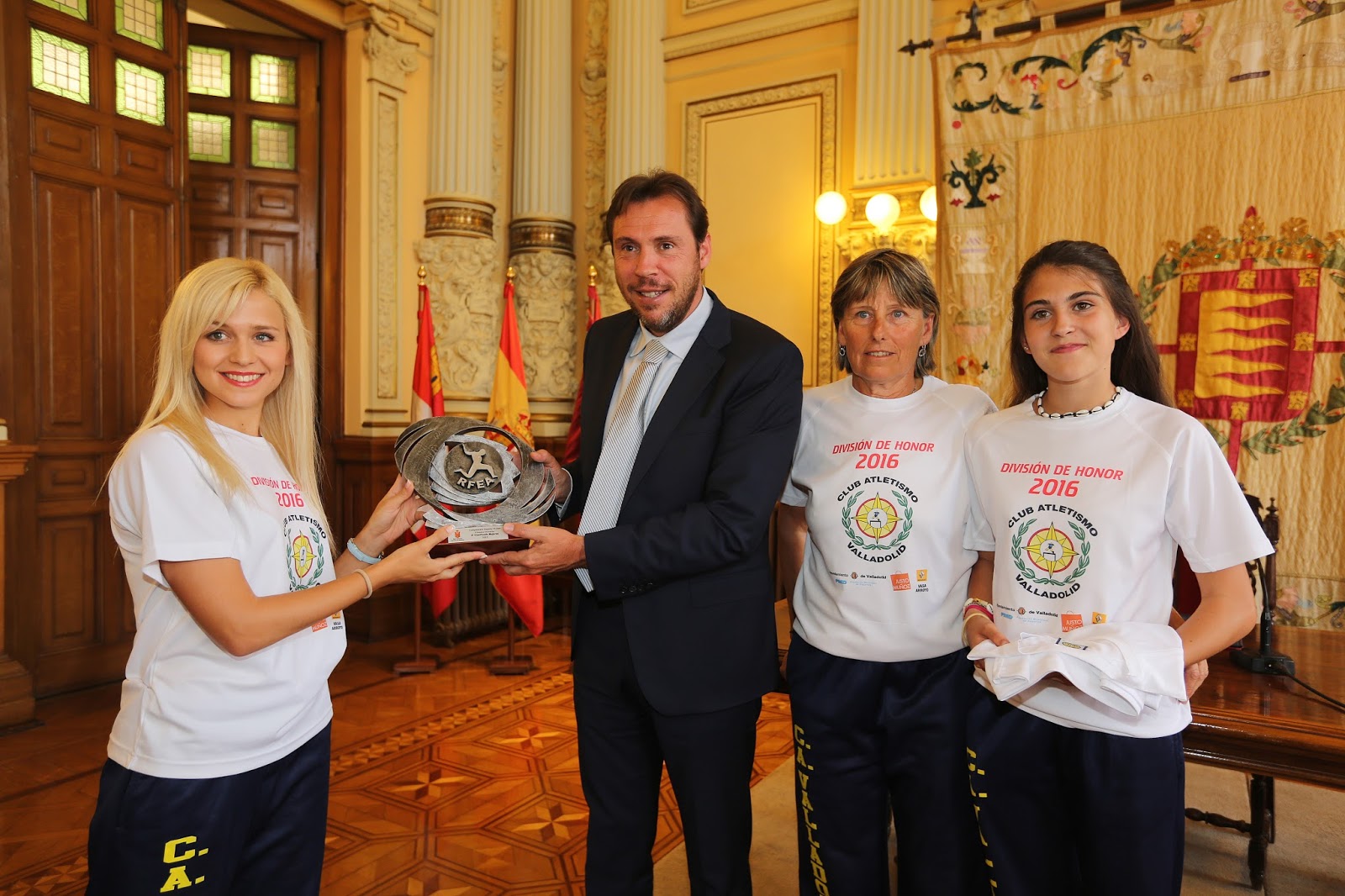 En el salón de recepciones del Ayuntamiento de Valladolid una buena parte de las componentes del Club Atletismo Valladolid-Universidad de Valladolid que consiguieron el ascenso a División de Honor, han sido recibidas por el Alcalde la ciudad, Oscar Puente, que estuvo acompañado en la mesa presidencial por el gerente de la Fundación Municipal de Deportes, Francisco de Borja, y por la Presidente del CAV, Ana Pérez Carnicero. Previamente, el concejal de Deportes, Alberto Burgos, departió con las atletas, al tener que ausentarse por otro compromiso.