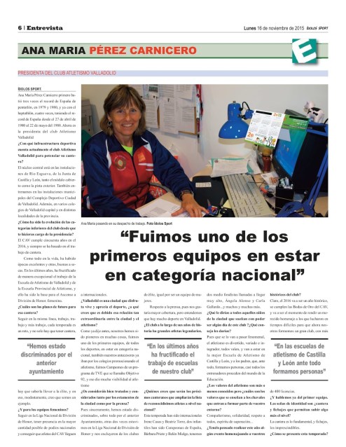 Chula, no, rechula, la entrevista que han hecho a Ana, la Presi, y en la que narra el pasado, el presente y el futuro del Club Atletismo Valladolid, que tiene 49 años de vida, que ha tenido momentos dulces y otros, menos dulces (nunca amargos…), que ha vivido épocas de economía saneada (y donde ha sido buena hormiguita…) y otras, pues no tan saneada, pero que lleva, eso, medio siglo siendo un equipo puntero en el atletismo femenino español… y tambien con los chicos..