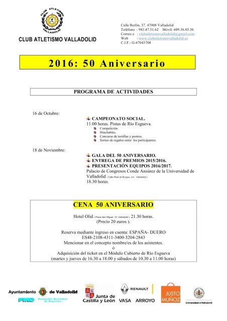 Ya están disponibles los tickets para asistir a la cena del 50 Aniversario, que tendrá lugar el 18 de Noviembre, justo después de la gran Gala…y cerca del Palacio de Congresos Conde Ansurez, así en un breve paseo, ni cinco minutos, nos plantamos en el Hotel Olid, donde tendremos una suculenta cena, un recuerdo para todos, sorteo de regalos, videos y fotos, muchas fotos, de los 50 años de vida del club…