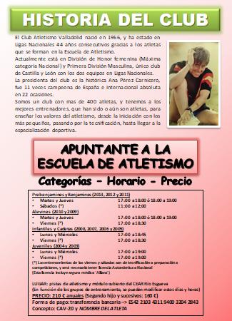 Ya está disponible el nuevo díptico del Club Atletismo Valladolid, más vistoso y renovado, en el que podéis ver toda la información para la nueva temporada que está a punto de comenzar.