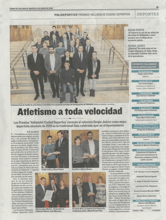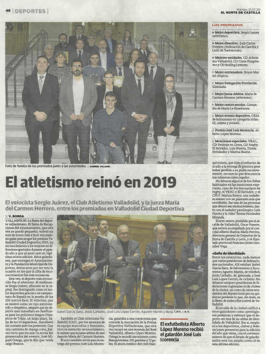 También hubo dos premios más para personas relacionadas con el atletismo, el ex atleta del CAV Sergio Juárez, fue premiado como mejor deportista de Valladolid en 2019 por su oro absoluto en la prueba de 100 metros lisos, título que también consiguió la histórica atleta del Valladolid Arantxa Iglesias, siendo también campeona de España de 100 lisos. Carmina Herrero recibió el premio como mejor jueza-arbitro por su largo historial de competiciones Nacionales e Internacionales de atletismo, enhorabuena a ambos!