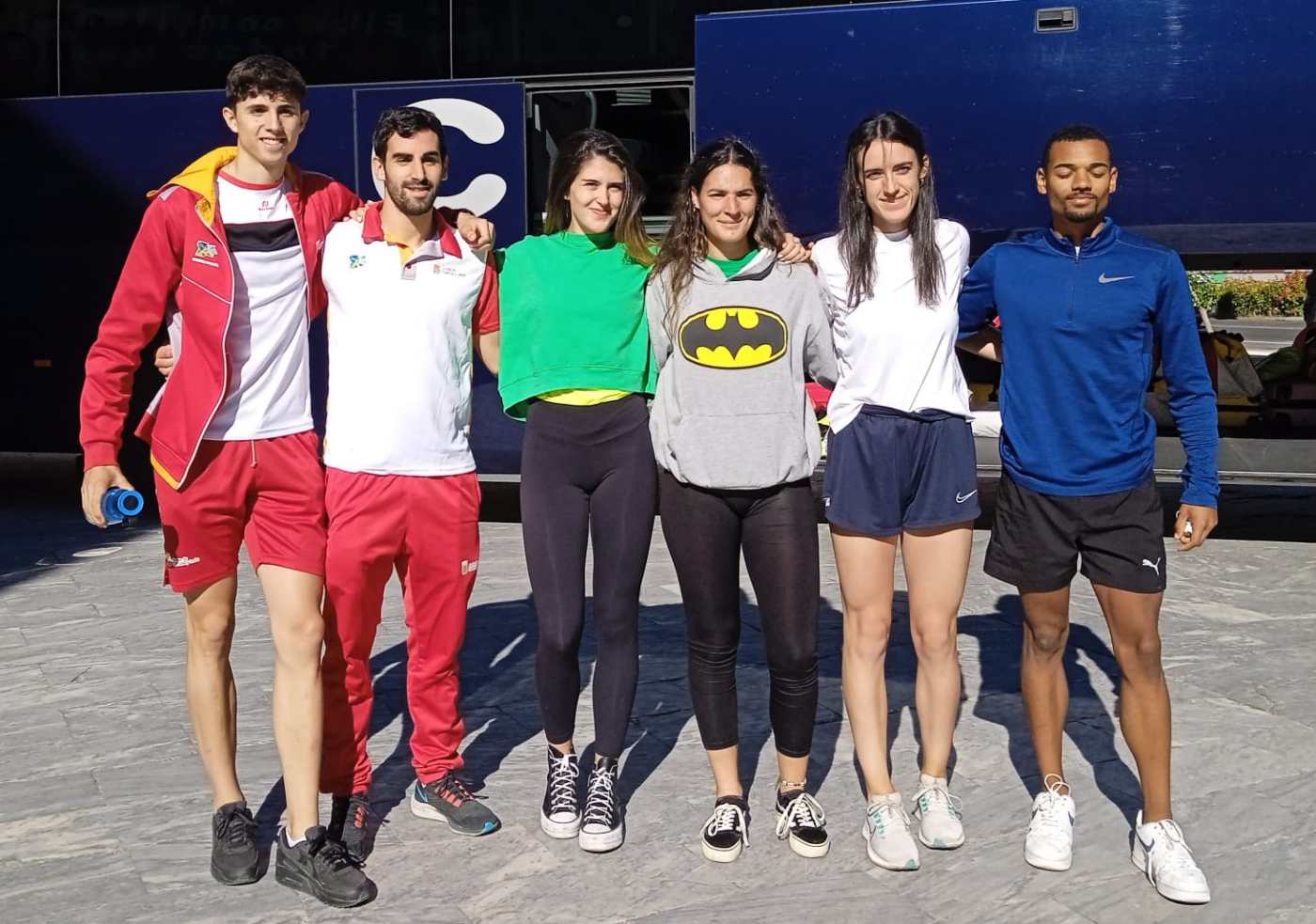 De izquierda a derecha, el más joven, el «adoptado´´ del Universidad de Burgos, Samuel Velasco, que competirá en la pértiga, David Sanz en el relevo 4×100, Laura Martín en el salto de altura, Mariví Álvarez en el lanzamiento de martillo, María Vega en el 4×400, y Denis Matsimouna también en el relevo 4×100.